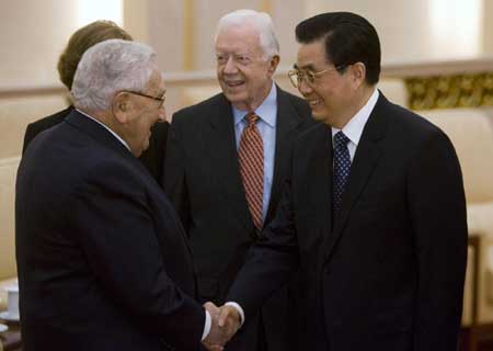 Hu told Carter: "For a long time, irrespective of whether you were in office or had retired, you have made great efforts to build the friendship between the two countries and develop ties. I appreciate those efforts highly." Carter said: "For all American citizens, particularly for these leaders, this is a wonderful occasion to celebrate." Developing a constructive partnership is in the fundamental interest of the two countries, Hu said. They should increase exchanges, deepen mutual trust, expand cooperation and promote durable bilateral ties. "As the biggest developing nation and the biggest developed nation, China and the US shoulder the common responsibility of world peace and development The importance and impact of China-US ties go beyond bilateral relations," Hu said. Expressing his wonder at the rapid change in China, Carter said: "All of us including Deng Xiaoping ... would have been amazed 30 years ago at the great changes that have taken place not only in your own country, but in the relationship between our two nations." Vice-President Xi Jinping hosted a banquet last night to welcome the US delegation. Xi said the two countries should abide by the three Sino-US joint communiqus and respect each other's core interests. Carter responded that the Sino-US relationship "is the most important diplomatic relationship in the world today". The 84-year-old Carter's relationship with China began 60 years ago - on October 1, 1949, to be precise - the day the People's Republic of China was founded. Carter visited China as a submarine officer on that day, when he turned 25. "Deng Xiaoping thought fate had brought me to the Chinese people and I thought the same way," he said earlier at a seminar to mark the 30th anniversary. In 1978, Carter decided to normalize ties with China and "bring about this enormous change", even though he was still president-elect and had not stepped into the White House. After assuming the US presidency in January 1979, Carter invited Deng to visit the US. "To my surprise, he accepted and said 'I'll be there in two weeks'." Deng reached the US on Jan 28. "One of the most unforgettable events was on the stage at the Kennedy Center, when Deng Xiaoping appeared along with little American children who had learned his favorite songs, and they sang these songs in Chinese," Carter said. "And as he kissed the little children, including my 9-year-old daughter, many people in the audience wept It was one of those glorious events that no one would ever forget." That was a "very great turning point" in his personal life and in the life of Americans and Chinese, he said. This is Carter's eighth visit after leaving the White House. Before departing for Beijing this time, he said establishing diplomatic ties with China was the "wisest" decision he had ever made.