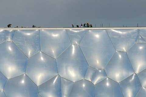 | Workers work atop of the National Aquatic Center, nicknamed the "Water