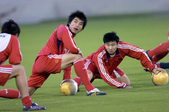 Zhi,left 2nd, undergoes training with his teammate Zhou Haibin (R) to