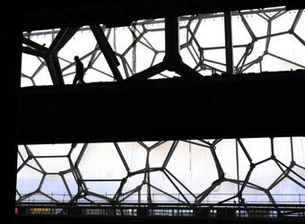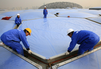 Workers install the last piece of the National Aquatics Centre's plastic film exterior in Beijing December 26, 2006. The plastic film on the outside layer of the centre, which is also called the 'Water Cube', is known locally as the membrane structure. Swimming, diving, synchronised swimming and the water polo final will be held in the centre during the 2008 Beijing Olympic Games.[Reuters]