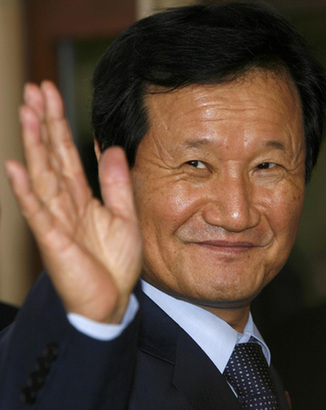 South Korea's Finance Minister Yoon Jeung-hyun waves as he arrives prior to the G20 Finance Ministers meeting at a hotel near Horsham, in southern England March 13, 2009. [Agencies]