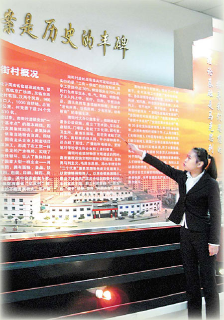 Work to build apartment buildings began in 1991. Liu moved into a three-bedroom apartment two years later, and worked in a factory till 2004. "I'm just an ordinary farmer. I'll be grateful all my life to the village cadre who have helped us get where we are now ... this happy life of ours didn't come easy," she says. Like all Nanjie villagers, Liu is entitled to 15 kg of flour and 60 yuan of welfare tickets a month. Though she doesn't work any more, she still earns 200-300 yuan a month for hosting field experience programs every day for the village tourism company. People began visiting Nanjie in the 1990s, but it wasn't until 2004 that the village leadership started a tourism company, charging visitors for random visits to houses and sightseeing tours. That was also the worst year for village economy. Almost every employee in the company is from outside the village. Ni Yandi, 22, from Linying county, is one of them. Long been attracted to Nanjie (the village is part of her county), she applied to work for the village after graduating from high school in 2004. The village has not only given her a job, but also allotted her a dormitory. "It's very nice working here. I don't have to think about a lot of things because most things are taken care of," she says. "Out there (outside the village), it's a messy world." To some extent, Nanjie's economy depends on the 6,000 migrant workers (excluding the 3,000 honorary residents) like Ni, many of who have settled down in the village. These migrant workers - an overwhelming number of them women - are employed mostly in the village's factories, restaurants, museum, hotel and the tourism firm. Non-Nanjie residents even hold some key posts. Sheng Ganyu, director of the weekly Nanjiecun News, is one. Having spent 12 years in Nanjie, Sheng is also responsible for dealing with the media and feels proud of his experience. "The amazing thing about Nanjie is it's home to about 600 people who have gone to or are still in college. Thirty of them have master's degrees, and one of them has a doctorate," Sheng says. "The village provides tuition fees and travel expenses for all of them, but has never forced any of them to return. People come back only if they want to; there's no obligation attached. Now, how many villages have that kind of confidence?" The Li siblings have returned for the most realistic reasons - a good pay with welfare and the comfort of staying at home. Li Chongyang graduated from Shenyang Pharmaceutical University this summer and works in the village's pharmaceutical firm for 800 yuan a month. The village paid all her tuition fees, more than 6,000 yuan in the first year and about 5,000 yuan each for the rest of the three years. "There's no place like home," Chongyang says. "All my classmates envied me the money the village gives you is like the money your parents give you And I don't feel much of a difference between here and Shenyang." Chongyang is one of the five Nanjie youths who went to Shenyang Pharmaceutical University in 2004, and all but one have returned. Her elder brother Li Yanfu, too, has returned after earning a diploma from the Beijing Printing Institute. An employee with the Sino-Japanese joint venture Naikeda color-printing firm, Yanfu got married at an annual group wedding on Oct 1. He has been allotted a new two-bedroom apartment, which he will move into soon. But unlike most senior residents, Yanfu says it depends whether he will live in the village all his life. "Right now, I'm here because there's not much pressure, and I can learn the things I would have outside the village. And I think it's time I paid something back to Nanjie." Nanjie villagers watch the standard 42 channels, including the Nanjie channel that telecasts a 30-minute program every Saturday night. Most of the villagers are Internet surfers, curious to know about the world outside as much as it is about them. Very few, though, know about the recent farmland reform. But then, the younger generation doesn't have the same sense about land as rural youngsters elsewhere. Unlike most other villages, farm workers in Nanjie aren't afraid that their children will sell the land one day if the policy allows it. Chongyang's instant reaction to the news is enlightening: "What, land? We've been working the land together forever."