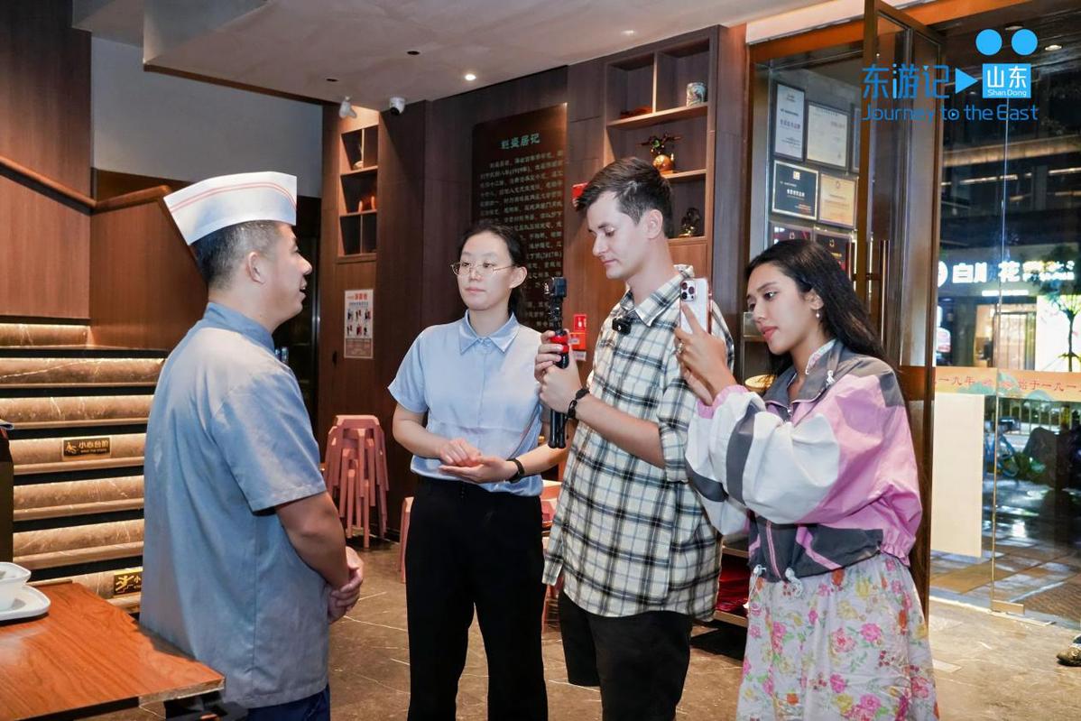 The head chef of Kuishengju, an authentic restaurant and the epitome of local flavor, introduces Shandong cuisine to the foreign couple in Jinan, East China's Shandong province. [Photo provided to chinadaily.com.cn]