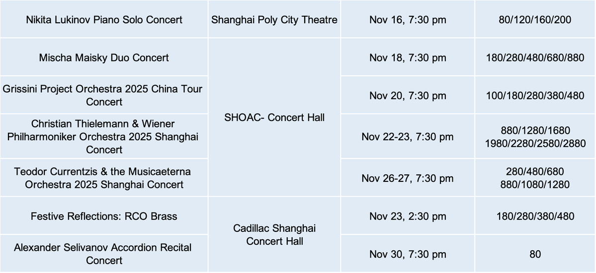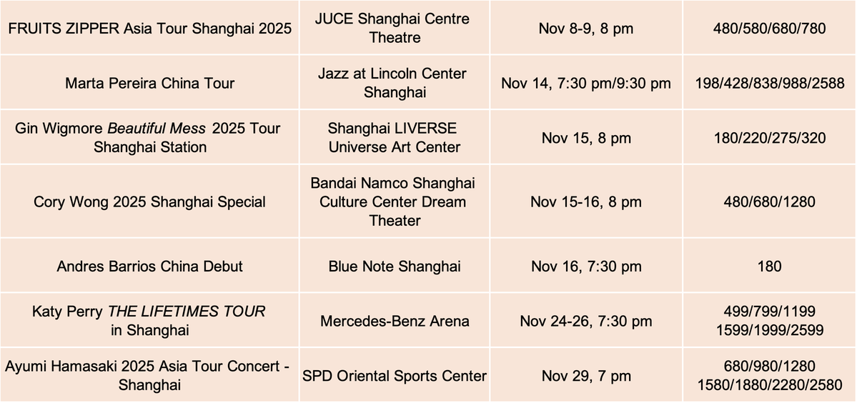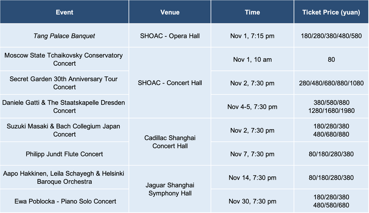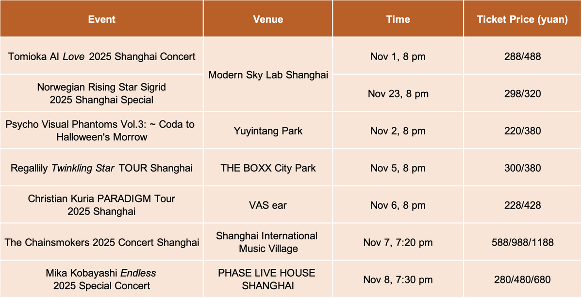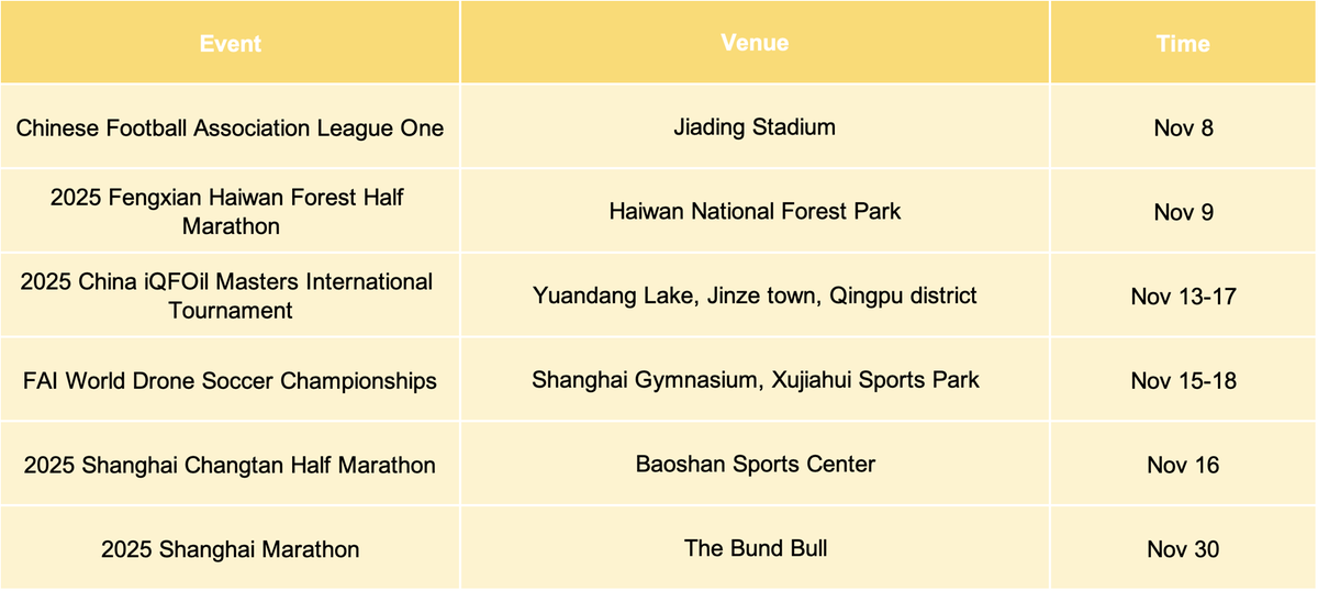 Sources: Shanghai Administration of Culture and Tourism, Shanghai Administration of Sports, official sporting events/performances/exhibitions/livehouse mentioned above