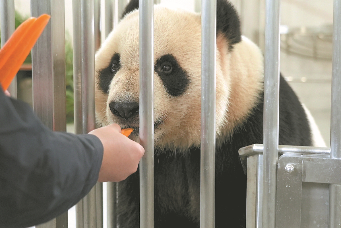 Giant panda Su Yang is fed by a keeper after arriving at the base in Mianyang on Tuesday. A total of 13 giant pandas settled in the facility on the same day. XINHUA