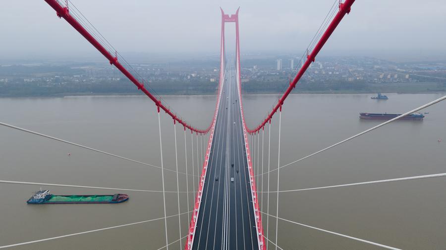 China's first double-deck cable-stayed suspension bridge opens to traffic over Yangtze