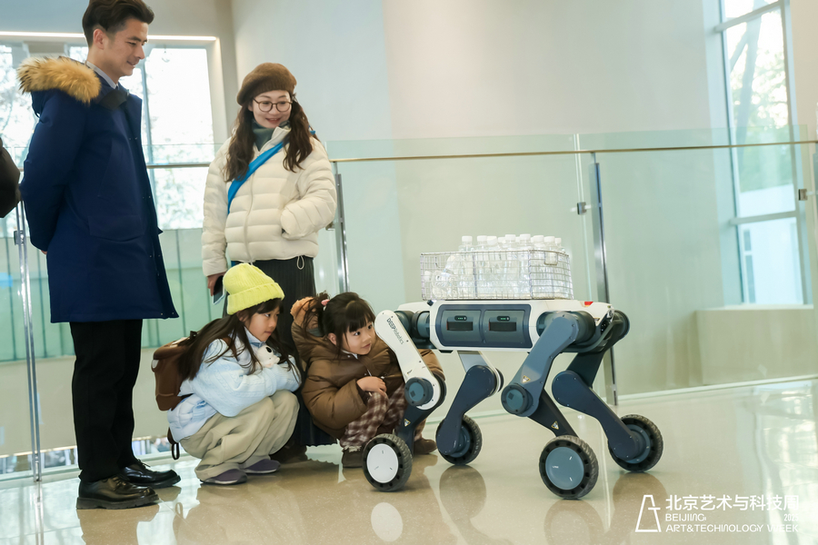 A robot dog delivering water at the opening ceremony of the 2025 Beijing Technology and Art Week on Friday. [Photo provided to chinadaily.com.cn]