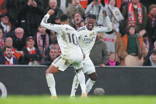 Eduardo Camavinga (right) celebrates after scoring Madrid's second goal with Kylian Mbappe, who provided the assist. AP