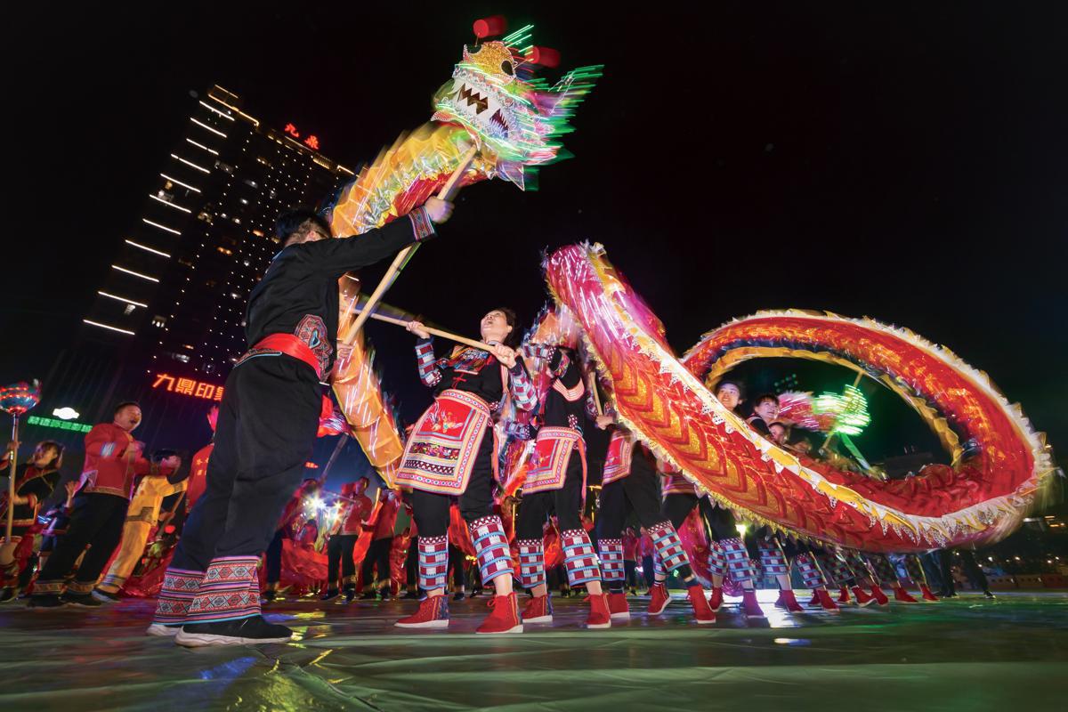 A grand dragon-lion lantern festival illuminates Jianghua Yao autonomous county in Yongzhou, Hunan province, on Dec 3, 2025. [Photo by Li Zhonglin/For chinadaily.com.cn]