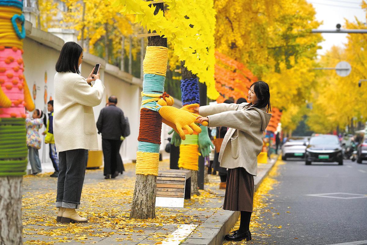 Residents take photos with ginkgo trees wrapped in colorful yarn at the Chengdu High-Tech Zone, Sichuan province, on Dec 6, 2025. These "Hug Trees" were decorated by residents and students, and have quickly gone viral on social media. XIANG YU/FOR CHINA DAILY