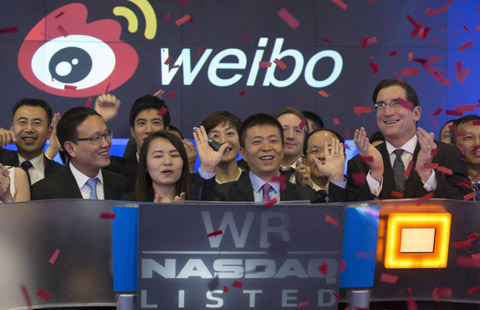 ![]() Weibo Corporation Chairman Charles Chao rings the opening bell at the NASDAQ MarketSite in Times Square in celebration of Weibo's initial public offering (IPO) on The NASDAQ Stock Market in New York April 17, 2014. [Photo / Agencies]