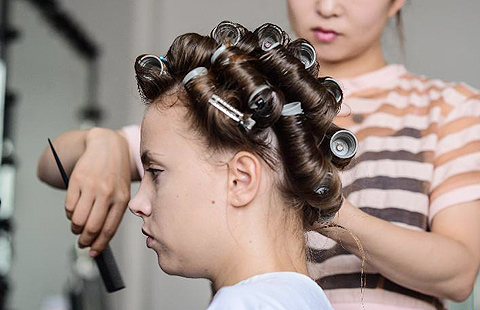 Slovakian model Patricia gets makeups applied in Puyuan township of Tongxiang city, East China's Zhejiang province, July 14, 2014. As a junior model, she is paid 2,000 yuan ($322) per day. With the booming development of woollen garment industry in Puyuan, many foreigners were attracted here and work as fashion models to earn their living. At present, over 100 foreigners are active models in the township, who come from at least 20 countries. In 2013, the annual turnover of woollen garment in Puyuan reached 23 billion yuan ($3.71 billion), accounting for 60 percent of the market nationwide. [Photo/Xinhua] |