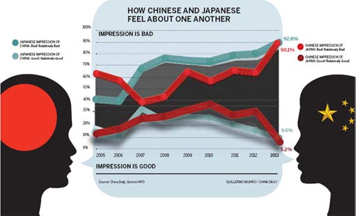 The impasse between Beijing and Tokyo over the Diaoyu Islands has badly hurt the attitude of both peoples toward their neighbor, with nine out of 10 saying they dislike the other nation, a recent survey has found.