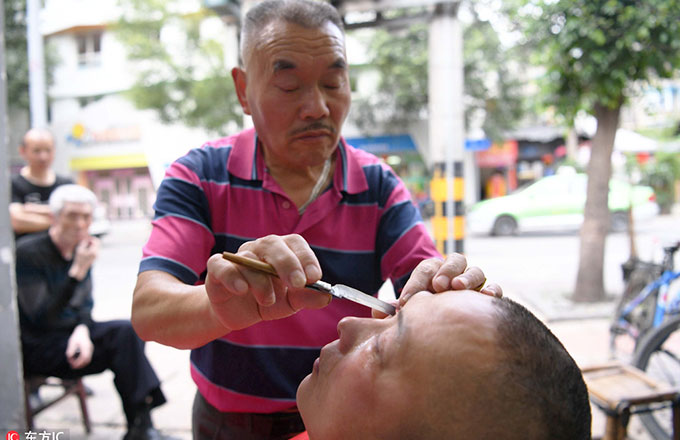 Chinese street barber Xiong Gaowu deftly scrapes a straight razor along the inside of his customer's eyelid.