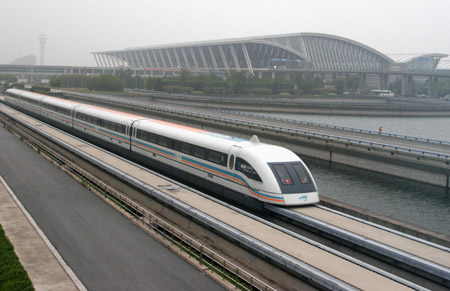 A running maglev train is seen in Shanghai on May 6, 2006. Maglev train can travel at a speed of up to 430 kilometres per hour and it saw soaring number of passengers during the May Day holiday. [newsphoto]