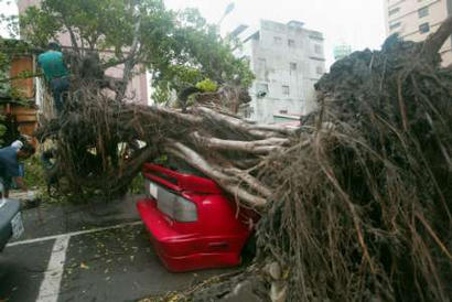 | Strong winds from Typhoon Dujuan uproot a large tree in Kaohsiung in southern Taiwan, September 2, 2003. The fast-moving storm, packing gusts of up to 190 kilometers per hour and one of the strongest typhoons to hit Taiwan this year, killed one person and left another missing on the island before heading towards Hong Kong and the south Chinese mainland coast. [Reuters] |