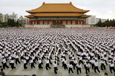 | 14,603 Tai Chi enthusiasts set a world record for the largest demonstration of the ancient Chinese martial arts in front of the National Theatre at the Chiang Kai Shek Memorial Hall park in Taipei November 23, 2003. The previous record was set by 10,425 Tai Chi practitioners in Hong Kong on December 2, 2001. [Reuters] |