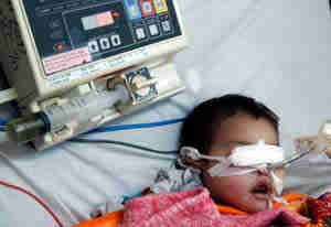 contracting Bird Flu breathes through a respirator at Hanoi's National Paediatric