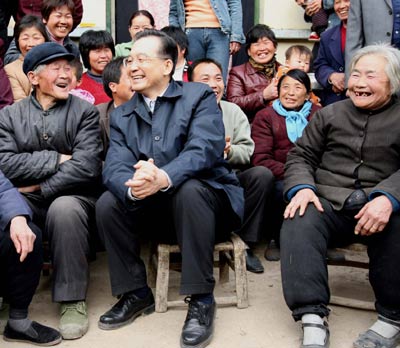 Chinese Premier Wen Jiabao (2nd R) talks with villagers in Nanshi village, Xia county of north China's Shanxi Province March 17, 2006. Wen made an inspection tour in rural areas in Shanxi Province on March 17-18. [Xinhua]