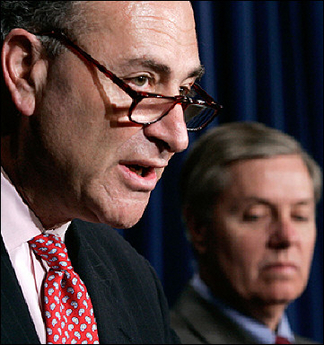 US Senators Chuck Schumer, D-NY, (L) and Lindsey Graham, R-SC, seen here at a press conference 15 March 2006. The two US senators, who have proposed  trade sanctions against China for its currency system said on a trip to China, they were optimistic Beijing will implement reforms, but said sanctions remained a possibility. [AFP]
