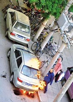 Wei parks outside the office building of the Beijing News, May 10, 2006.