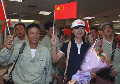 waved China's national flags as they got off the planes.