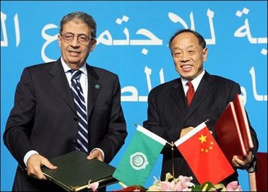 Moussa (L) and Chinese Foreign Minister Li Zhaoxing (R) pose with the