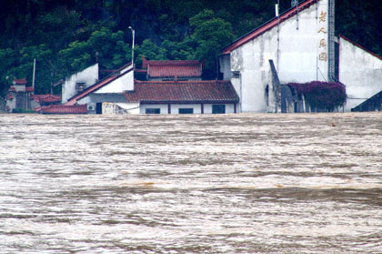 Fujian Province, are submerged in flood water with only roofs noticeable