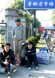 Migrant workers stay outside a job market in