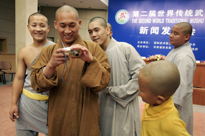 Shaolin monks look at their pictures on a