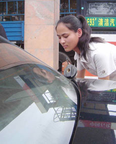 A worker fills a car at a gas station in Sheqi County,