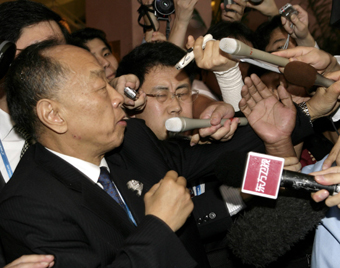 China's Foreign Minister Li Zhaoxing pushes his way through the media after a meeting with his Japanese counterpart at a hotel on Mactan Island, Cebu December 9, 2006. Japan's foreign minister invited either China's president or premier to visit Japan next spring for talks, Japan's Foreign Ministry spokesman told reporters on Saturday. Li did not give a definite response to Taro Aso's invitation during bilateral talks in the central Philippines, but expressed his appreciation, Mitsuo Sakaba said. [Reuters]
