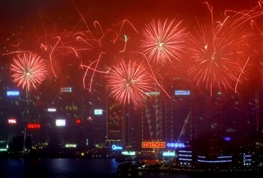 Fireworks explode over Hong Kong's Victoria Harbor Feb. 19, 2007, the second day of the year of the pig. [AP]