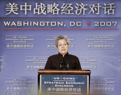 Chinese Vice Premier Wu Yi speaks during the beginning of the