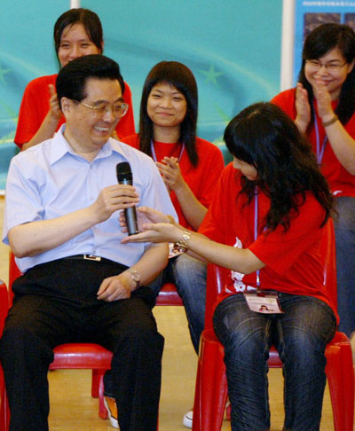 Chinese President Hu Jintao (L) chats with a group of students in Hong Kong