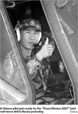 After combat preparations and joint training sessions at a range of the Russian Army's 34th Motorized Rifle Division last week, the joint forces of China, Russia, Kazakhstan, Kyrgyzstan, Tajikistan and Uzbekistan will "retake" a town from "terrorists" today, bringing an end to "operation rescue". "The six countries' armed forces have coordinated excellently in commanding, planning and combat operations. It's difficult to distinguish whether it is a multinational force or that of an individual country in action," General Xu Qiliang, deputy chief of the General Staff of the People's Liberation Army (PLA), said. General Xu is also the Chinese commander-in-chief for the joint exercise. "To this end, we have done a lot despite the language differences and disparities in tactics," Xu said. About 6,500 troops are part of SCO's largest counter-terrorism exercise. About 500 combat vehicles and 80 aircraft from Russia and China, about 2,000 Russian and 1,600 Chinese personnel, two paratrooper companies (of about 100 men each) from Tajikistan and Kazakhstan, and a platoon from Kyrgyzstan comprise the joint forces. Observers said the leaders' presence at the war game, the first time in the history of the SCO, demonstrates their determination to combat the three evil forces of terrorism, separatism and extremism that pose a threat to peace and stability in the region. Till last year, defense ministers were the highest ranking officials to watch the bilateral or trilateral military exercises. The purpose of the joint anti-terrorist maneuver is to "demonstrate the determination of the SCO member states in the fight against the three evil forces, as well as the common desire to ensure security and stability in the region and stimulate common development and prosperity," Vice-Chairman of Central Military Commission, State Councilor and Defense Minister Cao Gangchuan said after arriving at Shagol airfield outside Chelyabinsk on Wednesday. |