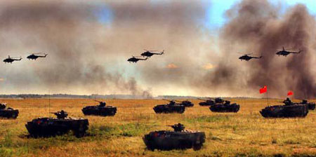 Helicopters and armoured vehicles advance in formation during the final stage of the Peace Mission 2007 counter-terrorism drill, sponsored by the Shanghai Cooperation Organization, in Chelyabinsk in Russia's Ural Mountains region, August 17, 2007. Leaders and defense ministers from SCO's six member countries gathered in the Chebarkul military range near Chelyabinsk in the morning to observe the drill, which is also due to end on Friday. [Xinhuanet]