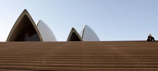 An Asia-Pacific Economic Cooperation (APEC) summit worker talks on a mobile phone in front of the Sydney Opera House August 31, 2007. The Sydney Opera House is the main APEC venue in Sydney and will be closed to the public for five days from next Tuesday. [Reuters]