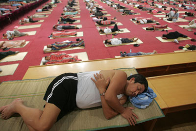 Poor parents of freshmen at Central China Normal University in Wuhan, Hubei Province sleep on the floor surface of the school's gymnasium on September 3, 2007. The school also provided sleeping mats, coverlets, bath facilities and hot tea. [newsphoto]