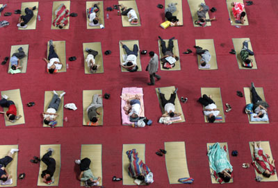 Poor parents of freshmen at Central China Normal University in Wuhan, Hubei Province sleep on the floor surface of the school's gymnasium on September 3, 2007. The school also provided sleeping mats, coverlets, bath facilities and hot tea. [newsphoto]