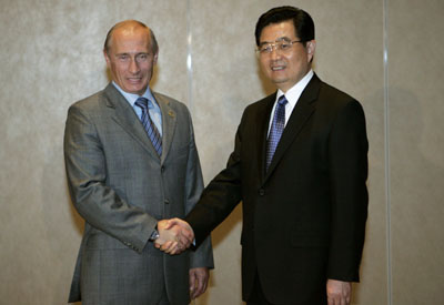 President Hu Jintao (R) shakes hands with Russian President Vladimir Putin during a bilateral session on the sidelines of the Asia-Pacific Economic Cooperation (APEC) leaders meeting in Sydney September 8, 2007.[Reuters]