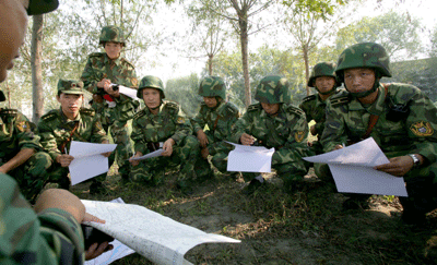 Soldiers hold group discussions about tactics during the exercise dubbed as "Queshan 2007" by the Jinan Military Area Command of the Chinese People's Liberation Army (PLA) in central China's Henan Province Sunday, September 23, 2007. [Xinhua]