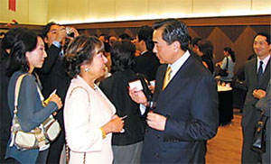 Left: Wang Yi talks with Japanese visitors invited to the Chinese Embassy in Tokyo in November 2004. Most of the Japanese were living or working near the embassy. [Courtesy of the Chinese Embassy to Japan]