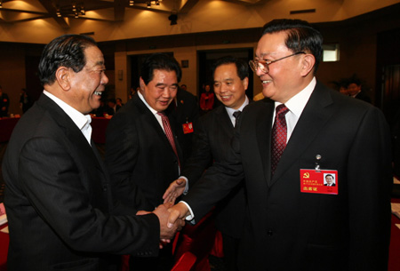 Luo Gan (R), member of the CPC Central Committee Politburo Standing Committee, shakes hands with a deputy as he attends the group discussion of the Shandong Province delegation of the 17th National Congress of the Communist Party of China in Beijing, October 15, 2007. [Xinhua]