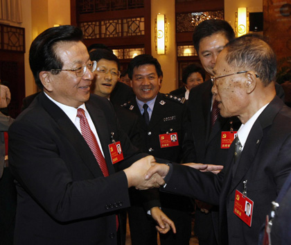 Zeng Qinghong (L), member of the CPC Central Committee Politburo Standing Committee, shakes hands with a deputy as he attends the group discussion of the Jiangxi Province delegation of the 17th National Congress of the Communist Party of China in Beijing, October 15, 2007. [Xinhua]