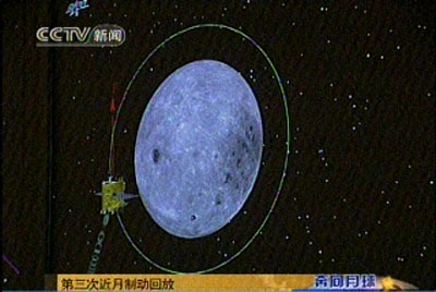 The CCTV footage shows that China's first lunar probe Chang'e-I successfully completed its 1,580,000-km flying journey to the moon after entering its final working orbit on Wednesday's morning, Nov. 7, 2007. [CCTV.com]
