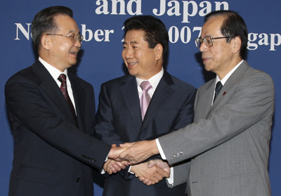 Chinese Premier Wen Jiabao (L), South Korean President Roh Moo-hyun (C) and Japanese Prime Minister Yasuo Fukuda shake hands before their trilateral meeting on the sidelines of the 13th Association of Southeast Asian Nations (ASEAN) Summit in Singapore November 20, 2007. [Agencies]