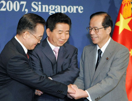 Chinese Premier Wen Jiabao (L), South Korean President Roh Moo-hyun (C) and Japanese Prime Minister Yasuo Fukuda shake hands before their trilateral meeting on the sidelines of the 13th Association of Southeast Asian Nations (ASEAN) Summit in Singapore November 20, 2007. [Agencies]
