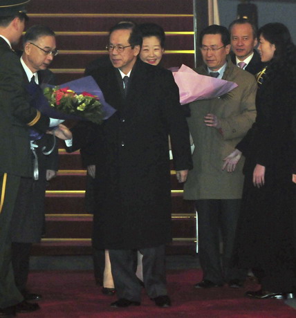 Japanese Prime Minister Yasuo Fukuda (C) and his wife Kiyoko are welcomed by Chinese vice foreign minister Wu Dawei (R) as they arrive in Beijing December 27, 2007. Fukuda is scheduled to meet President Hu Jintao, top legislator Wu Bangguo and Premier Wen Jiabao on Friday. [Agencies]