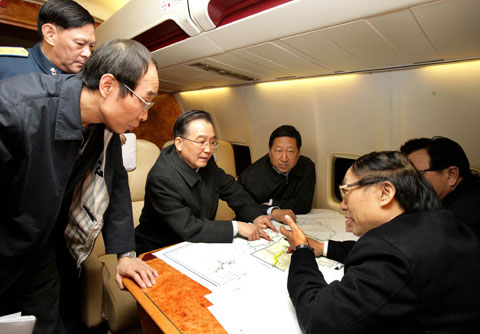 Chinese Premier Wen Jiabao (3rd from left) discusses relief work plan with other officials on the way to Hunan province in central China on Monday evening, January 28, 2008. [Xinhua]